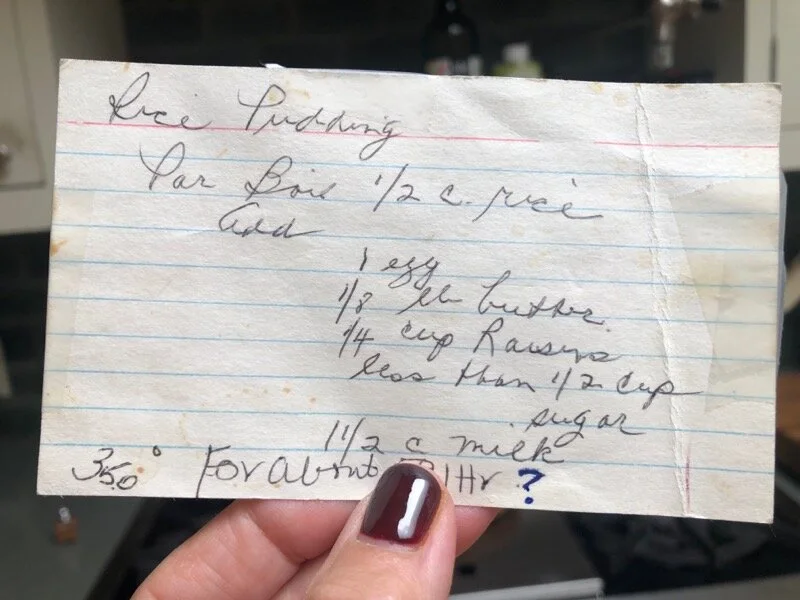 Remember that recipe for rice pudding you wrote on an index card? Well, I love that I have something with your handwriting but you never said how long I should leave it in the oven! I’m always having to guess.