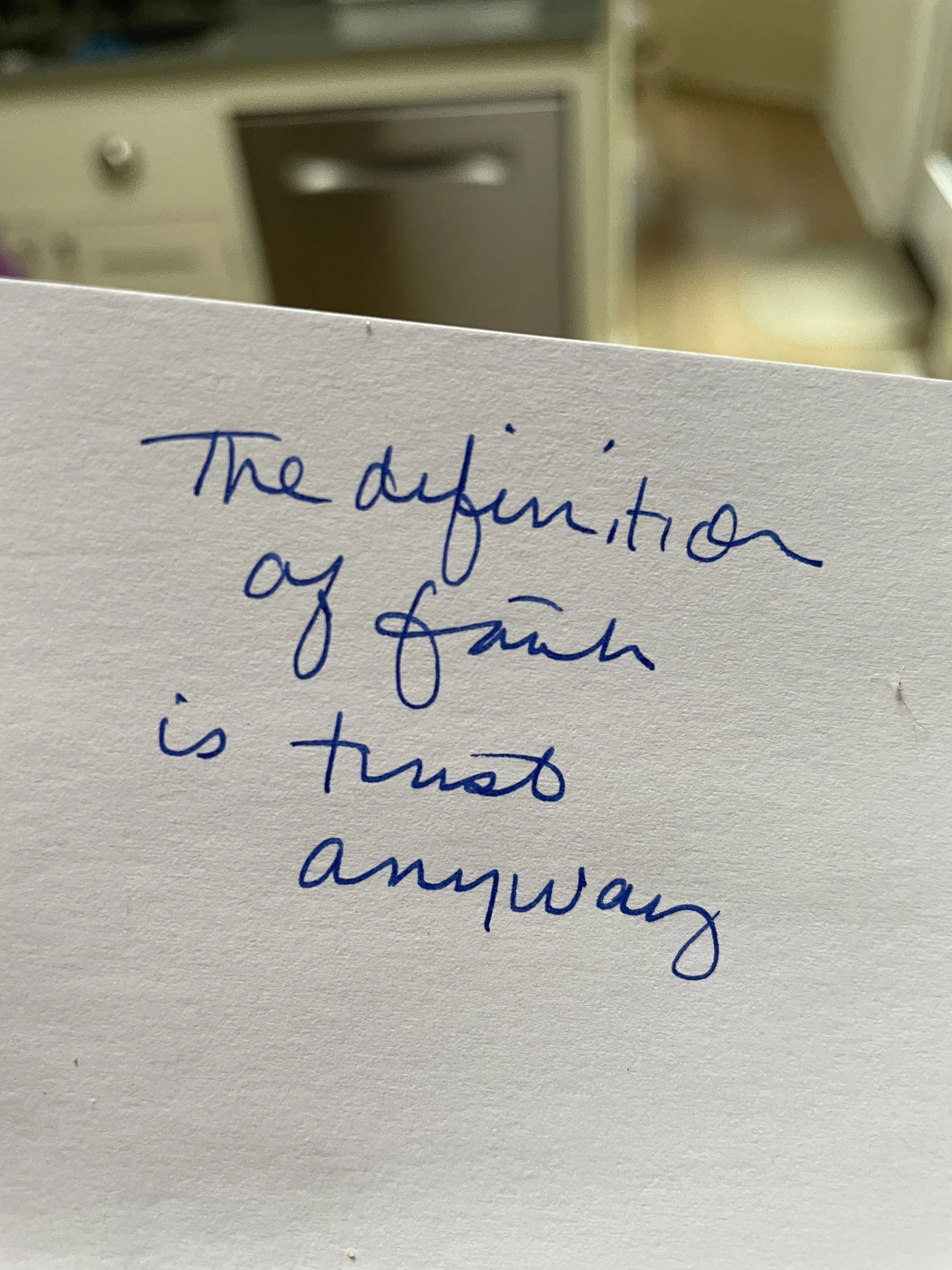 Last Tuesday morning I FaceTime’d with my daughter Layla, and told her I’ve been thinking a lot about faith. She, in an effort to comfort me, said the definition of faith is “trust anyway.” God I love her.